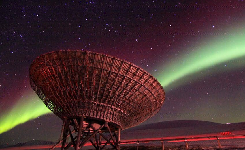 Northern lights (Aurora Borealis) over the EISCAT Svalbard Radar. Photo: Njål Gulbrandsen/UNIS.