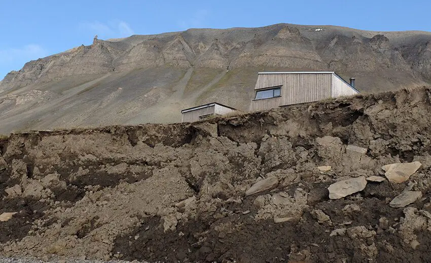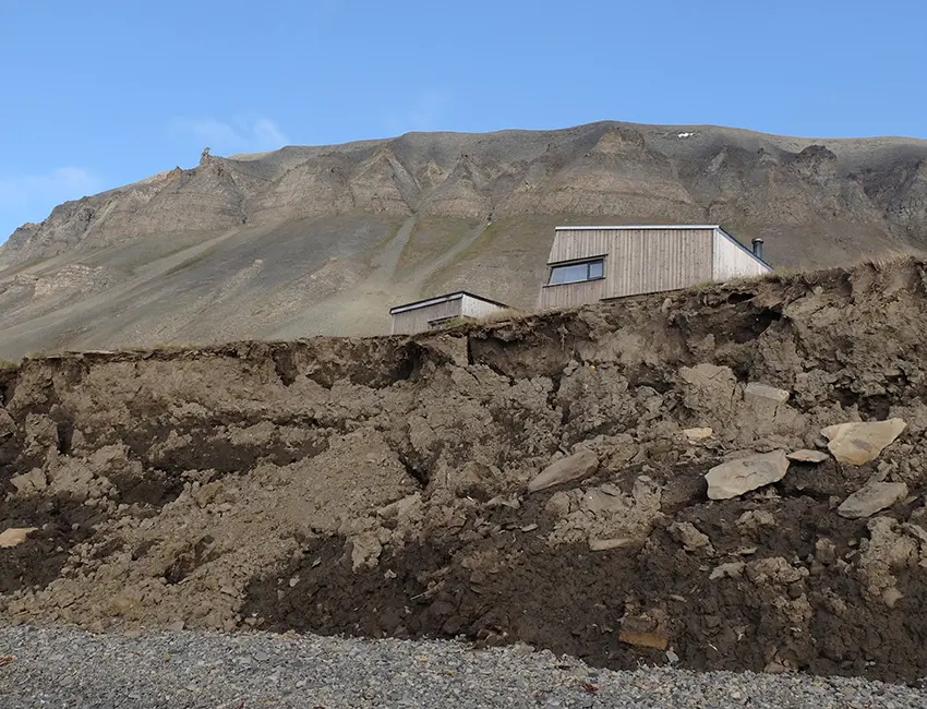 Cabin threatened by coastal erosion, Bjørndalen. Photo: Eva Therese Jenssen/UNIS