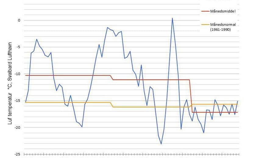 Top image: Air temperatures at Svalbard airport from 1 January to 16 March 2019 presented as daily average temperature (blue) and monthly average (red) against normal monthly average (based on measurements in the period 1961-1990).