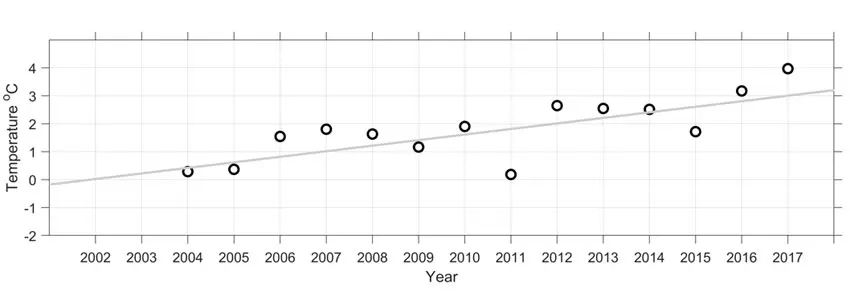 In 2002, the Scottish Association of Marine Science (SAMS) and the Norwegian Polar Institute established a marine observatory in Kongsfjorden. The observatory was open for the first year only during the summer, but as early as autumn 2003 it was continued in collaboration with UNIS. From 2005 until today, the observatory has been a collaboration between UNIS, UiT- The Arctic University of Norway and SAMS. From 2018, the observatory became an integral part of the national research infrastructure SIOS. During this period, we have only measured one year (2011) temperatures that are about as cold as now. Given the people in Longyearbyen wanting to go on scooter trips, this is probably very good news.