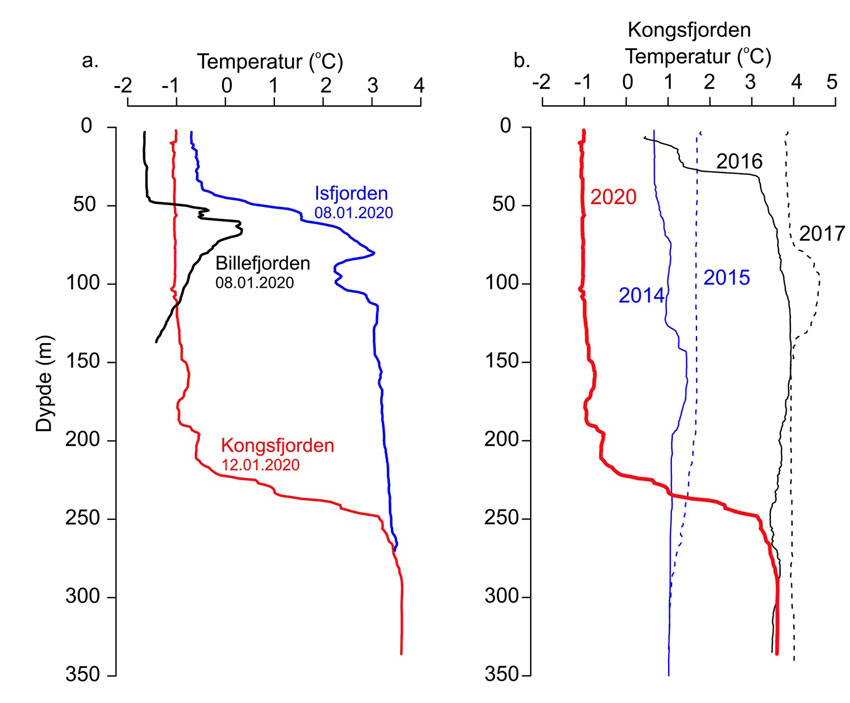 The last time Isfjorden was properly frozen was the winter of 2004-05. That year we went on fieldwork from UNIS to Billefjorden with snow scooters over the sea ice around Revneset and all the way in to Adolfbukta. Whether there will be a similar ice cover this year remains to be seen, but it is doubtful. However, there are clearly good opportunities for relatively large parts of both Isfjorden and Kongsfjorden to freeze. Seawater freezes as is known at -1.8C, and there is already a thick layer of cold water that insulates against the heat in the Atlantic water below (Figure A). So even though it still takes a longer cold (and quiet) period before it is possible to drive scooters over to Blomstrand or Skansen, at least the conditions are good for the new decade to start with a winter where the fjords are once again covered in ice. Unfortunately, the climate crisis is not canceled with this, as we are talking here about local conditions and processes. But we hope we can take a trip over safe sea ice this coming winter!