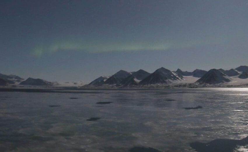 Top image: Kongsfjorden in clear weather, moonlight, northern lights and newly frozen sea ice. Photo: Malin Daase.