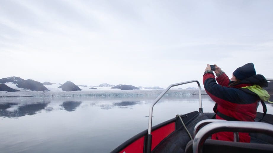 A tourist photographing the glacier front in Borebukta. Photo: Ingrid Ballari Nilssen