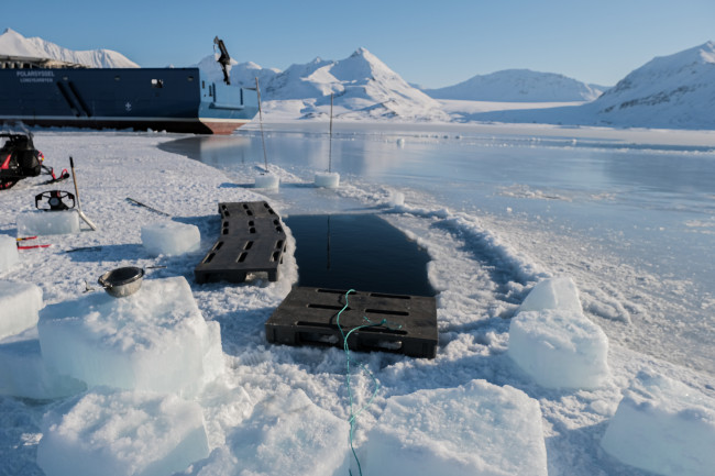 Her last comment fits conveniently. It’s the last day on the ice, and tradition is that the students go for a swim in the water they’ve studied over the past few days.