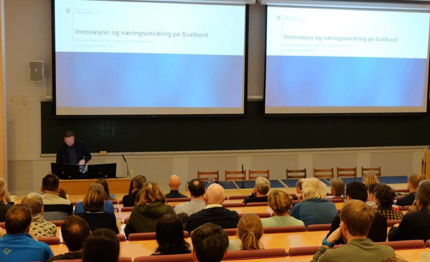 Top image: More than 100 people had come to hear state secretary Magnus Thue from the Ministry of Trade, Industry and Fisheries present the new business strategy for Svalbard. Photo: UNIS.