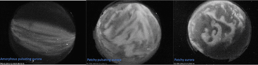 | Patchy pulsating aurora: A pulsating aurora with persistent aurora patch pulsating mostly over the entire sky. Amorphous pulsating aurora: Short-lived pulsating aurora which pulsates randomly and sometimes over the entire sky. Patchy aurora: An aurora with limited pulsation at the edge of the long-lived patch. |