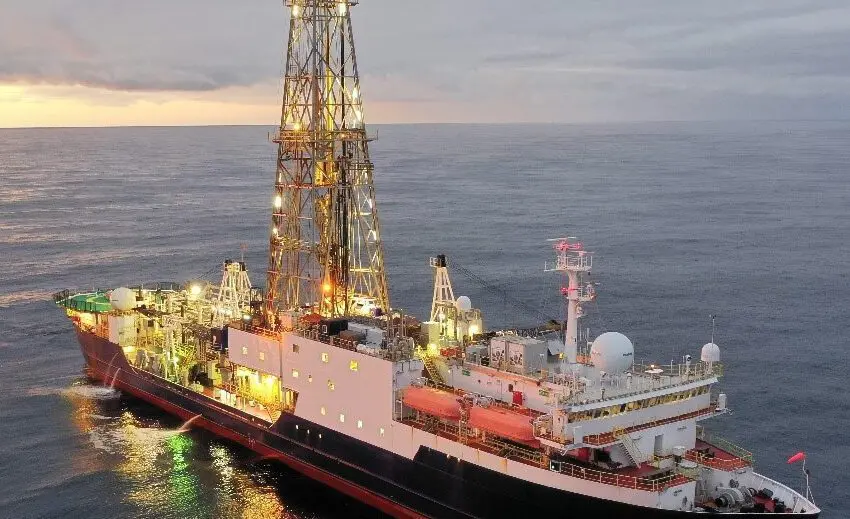 The massive drilling vessel Joides Resolution out at sea. Photo: Peter Betlem/UNIS