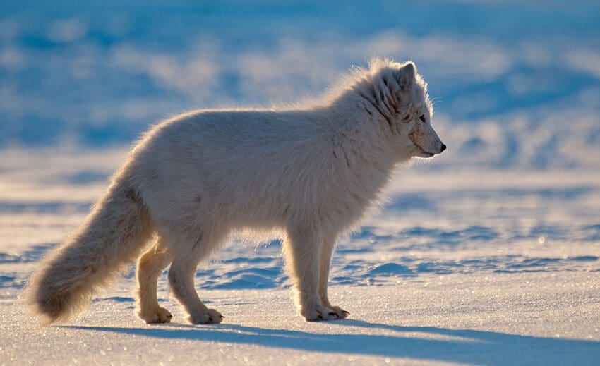 Top image: Polar fox (Vulpes lagopus) in April morning sun. Photo: Robert Pfau/UNIS