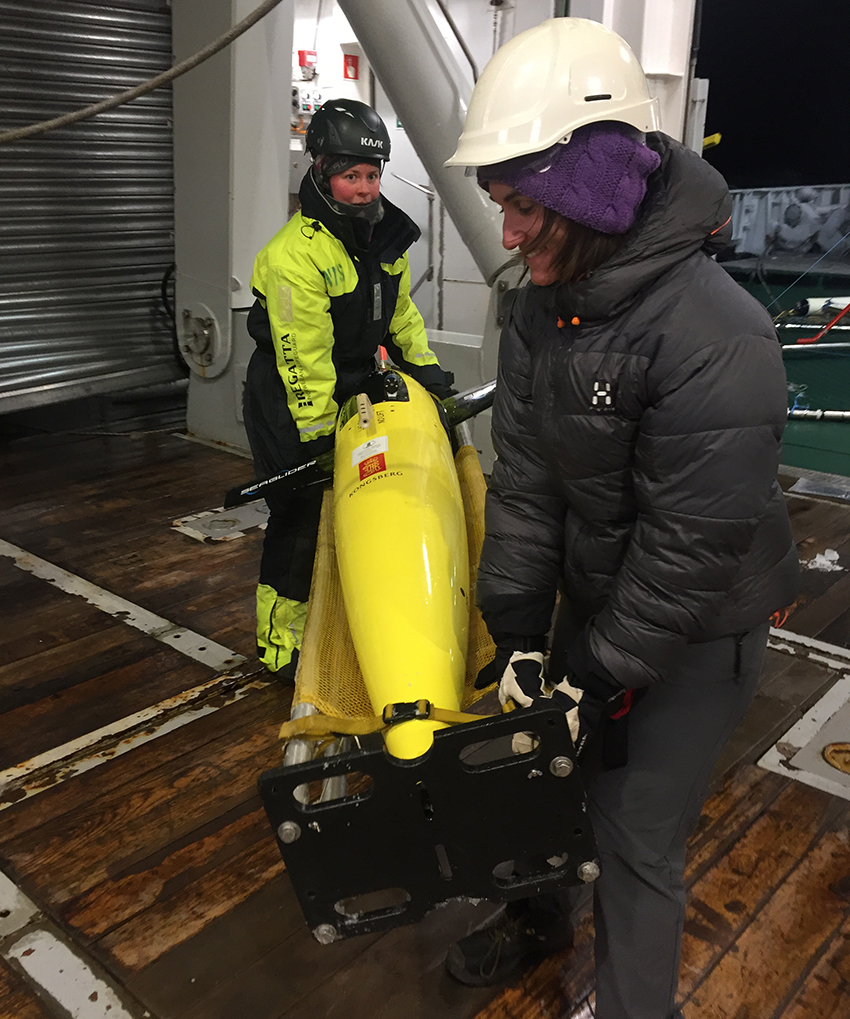 Top image: Kjersti Kalhagen is preparing a new current meter (ADCP) for the M4 rig onboard R/V Kronprins Haakon yesterday. The ADCP can measure ocean currents throughout the water column using sound propagation in water. This can also measure how much sea ice is drifting past. (Photo: Frank Nilsen/UNIS).