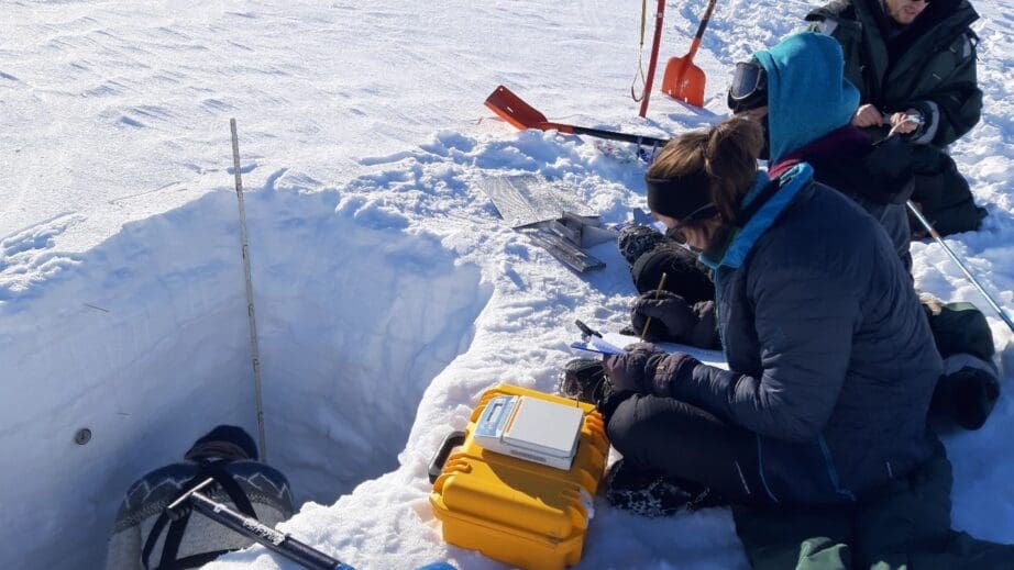 Students of the Arctic winter ecology course (AB329/829) are conducting snow pit measurements of snow temperature and density on Foxfonna glacier. Photo: Simone I. Lang.